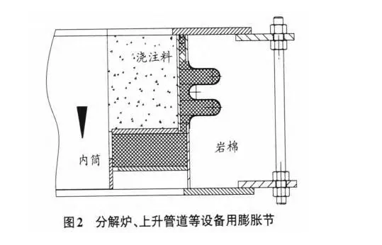 (3) 分解爐與喂料室連接處膨脹節(jié) 。 分解爐與喂料室連接處膨脹節(jié)見圖 3 。此處比較特殊,也是容易出現(xiàn)問題的地方。通常理解為,此處連接喂料室與分解爐,來自喂料室的高速氣流通過膨脹節(jié)進入上部分解爐,對膨脹節(jié)使用影響的是氣流,膨脹節(jié)應(yīng)該與圖 2 安裝方向相同。