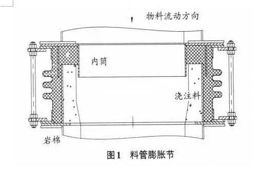 膨脹節(jié)是預(yù)熱器系統(tǒng)重要的附屬部件,在預(yù)熱器中大量應(yīng)用,比如分解爐、上升管道、料管等。其作用主要是吸收設(shè)備因溫度變化而引起的熱脹冷縮位移,防止設(shè)備因熱位移而損壞。