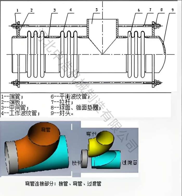 c、拉桿與其他部件約束與平衡:出了波紋管外, 曲管壓力平衡補償器還包括;拉桿、端板、封頭和墊圈等,這些部件在補償器工作中起到約束和平衡作用。其中,拉桿可以約束波紋管運動范圍,防止過度拉伸,而封頭又包括端板、球面和錐面墊圈等起到傳遞熱位移平衡壓力和推力作用。
