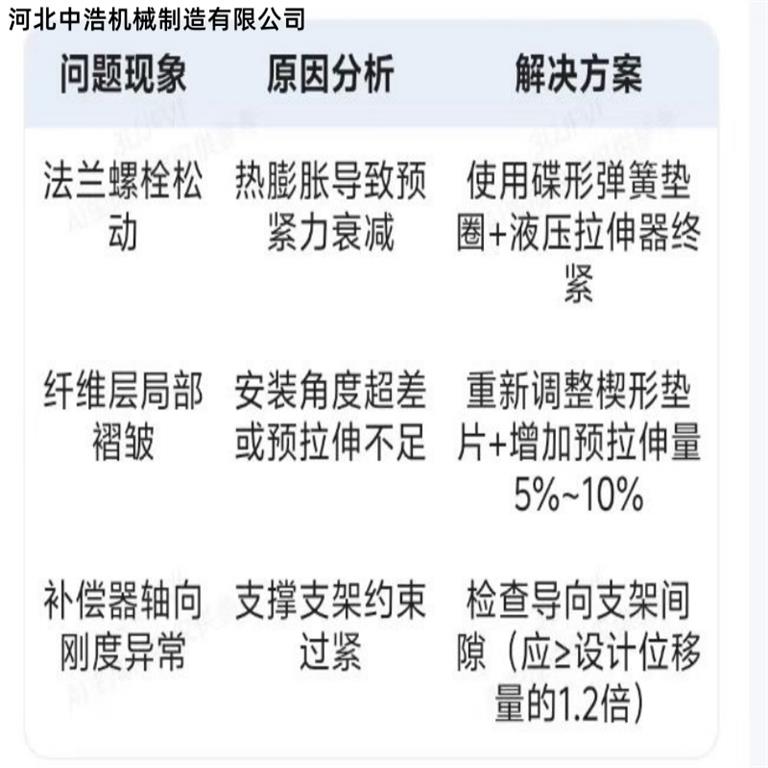 纖維織物補(bǔ)償器在安裝時(shí)避免不了安裝誤差,為了解決安裝誤差問(wèn)題中浩機(jī)械總結(jié)主要可從安裝前零誤差測(cè)量和定位到預(yù)變形量調(diào)整,其次對(duì)支撐結(jié)構(gòu)進(jìn)行優(yōu)化,分階段緊固與應(yīng)力調(diào)整,安裝后進(jìn)行試驗(yàn)測(cè)試,從而總結(jié)常見(jiàn)問(wèn)題及解決方法。